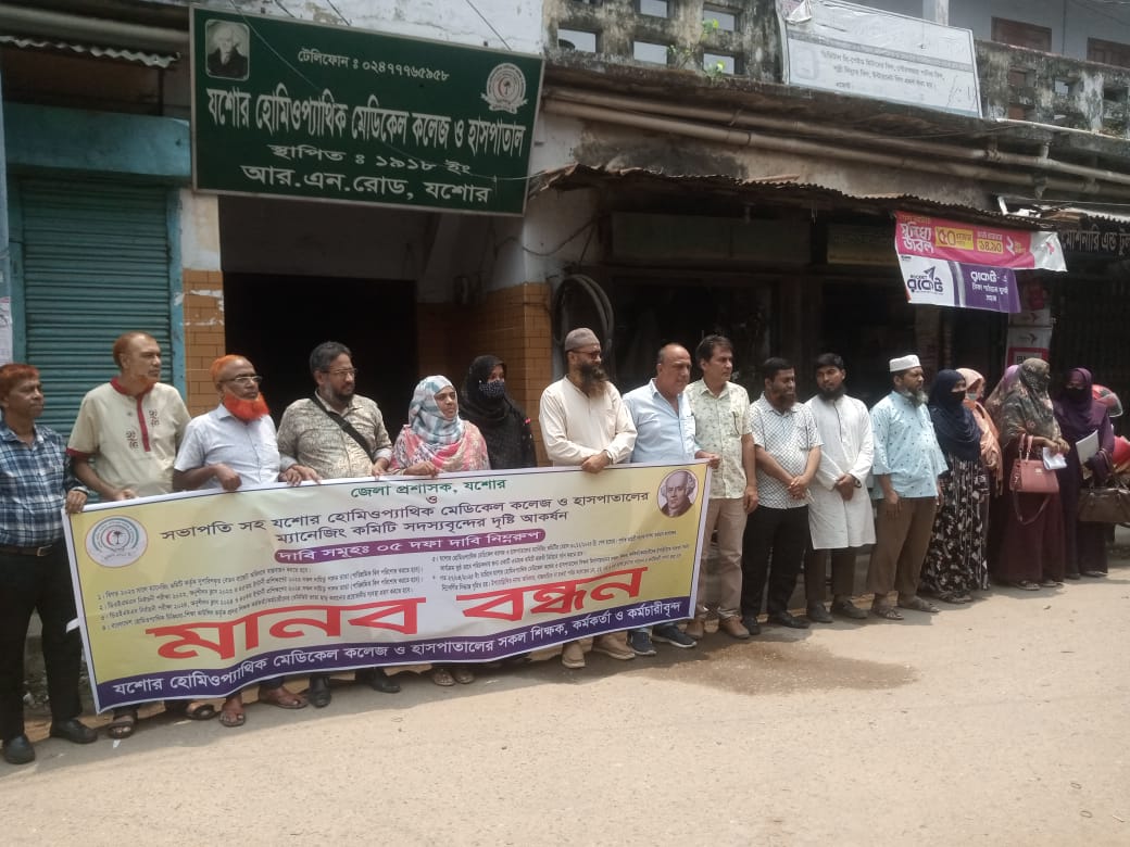 যশোর অফিস : যশোর হোমিওপ্যাথিক মেডিকেল কলেজ ও হাসপাতালের শিক্ষক-কর্মচারীরা পাঁচ দফা দাবিতে মঙ্গলবার মানববন্ধন করেছেন। দুপুরে কলেজ প্রাঙ্গণে আয়োজিত এ কর্মসূচিতে বিলম্বিত পারিতোষিক ও ভাতা পরিশোধ, বেতন বাজেট কার্যকর এবং নতুন ম্যানেজিং কমিটি গঠনের দাবি জানানো হয়।