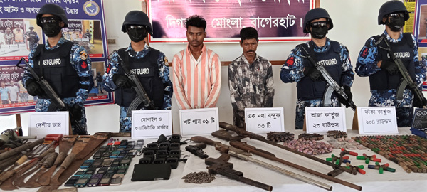 মোংলা প্রতিনিধি : রাত ভর অভিযান চালিয়ে অস্ত্র ও গোলাবারুদ সহ সুন্দরবনের দুর্র্ধষ বনদস্যু করিম শরীফ বাহিনীর সক্রিয় ২ সহযোগী আটক করেছে কোস্ট গার্ড। এসময় তাদের আস্তানা থেকে বিপুল পরিমান আগ্নয়াস্ত্র, গুলী ও অস্ত্র তৈরীর সরঞ্জাম উদ্ধার করা হয়েছে। মঙ্গলবার (৬ মে) সকালে কোস্ট গার্ড মিডিয়া কর্মকর্তা লেফটেন্যান্ট কমান্ডার এইচ এম এম হারুন-অর-রশীদ এ তথ্য জানান।