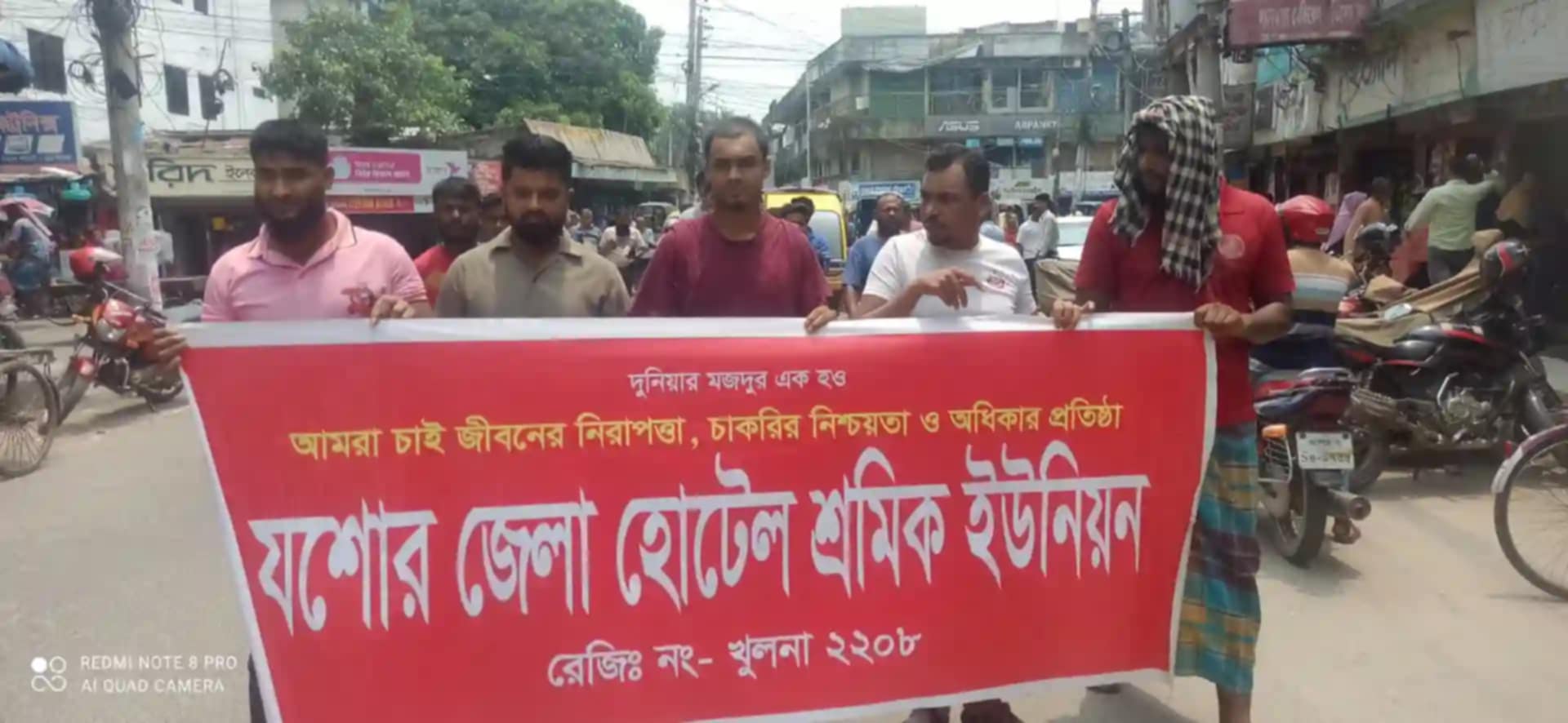 আজ ১২ মে ২০২৫ সোমবার দুপুর সাড়ে ১২টায় পাইপপট্টি মোড় থেকে একটি বিক্ষোভ মিছিল শহর প্রক্ষিণ করে প্রেসক্লাবের সামনে সংক্ষিপ্ত সমাবেশের মাধ্যমে শেষ হয়। যশোর জেলা হোটেল শ্রমিক ইউনিয়নের উদ্যোগে মিছিলোত্তর সমাবেশে সভাপতিত্ব করেন ইউনিয়নের সভাপতি মজিবর রহমান খান মহারাজ। বক্তব্য রাখেন ইউনিয়নের সাধারণ সম্পাদক কামাল পারভেজ বুলু, সহ-সাধারণ সম্পাদক আইয়ুব হোসেন ও বাংলাদেশ হোটেল রেস্টুরেন্ট মিষ্টি বেকারী শ্রমিক ইউনিয়ন যশোর জেলা কমিটির সাবেক সাধারণ সম্পাদক ফরিদ হোসেন প্রমুখ। নেতৃবৃন্দ বলেন, আমরা হোটেল সেক্টরে অবিলম্বে বর্তমান বাজারদরের সাথে সংগতি রেখে ৬ সদস্যের পরিবার বেঁচে থাকার জন্য মজুরি বোর্ডের মাধ্যমে ৩০ হাজার টাকা নিম্নতম মজুরি নির্ধারণ করে তা বাস্তবায়ন, পবিত্র ঈদুল আজহায় এক মাসের মজুরির সমান উৎসব বোনাস প্রদান, নিয়োগপত্র-পরিচয়পত্র-সার্ভিসবুক প্রদান এবং ৮ ঘন্টা শ্রম দিবস, অতিরিক্ত কাজের দ্বিগুণ মজুরি বাস্তবায়নের দাবিতে আমরা দীর্ঘ দিন আন্দোলন করে আসছি। কিন্তু করোনা মহামারীর পর থেকে মালিকপক্ষ নানা অজুহাতে আমাদের অর্জিত অধিকার অনেকাংশ হরণ করেছে। এ বছর ৫ মে হোটেল সেক্টরে নতুন গেজেট পাশ হয়েছে। এ প্রেক্ষিতে উক্ত গেজেট বাস্তবায়ন সহ উপরোক্ত দাবিতে আন্দোলনের বিকল্প নাই। এমতাবস্থায় যশোরের হোটেল শ্রমিকদের দাবি আদায়ে আগামী ১৯ মে সোমবার দুপুর ১২টায় শহরে বিক্ষোভ মিছিল শেষে প্রেসক্লাবের সামনে সংক্ষিপ্ত সমাবেশ ও ২১ মে বুধবার বিকাল সাড়ে ৪টায় যশোর দড়াটানা শহীদ চত্ত্বরে শ্রমিক সমাবেশ সফল করার আহ্বান জানান।