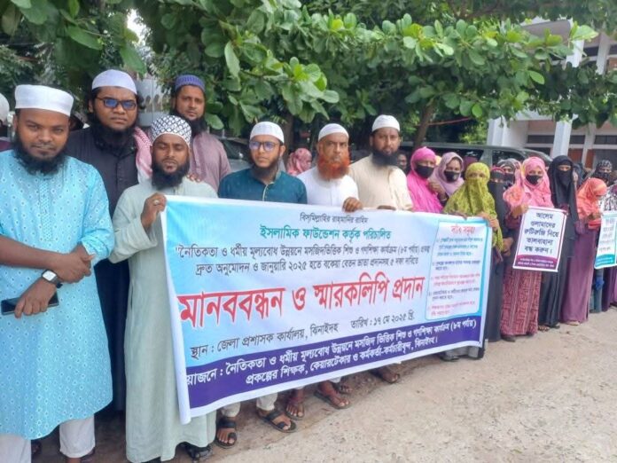 মানববন্ধনে ফিল্ড অফিসার আব্দুর রশিদ বলেন, ৩২ বছর ধরে পরিচালিত এই প্রকল্পটি দেশের প্রান্তিক পর্যায়ে শিশুদের নৈতিক ও ধর্মীয় শিক্ষা প্রদানের পাশাপাশি সামাজিক সচেতনতা গড়ে তুলতে গুরুত্বপূর্ণ ভূমিকা রেখে আসছে। বর্তমানে প্রায় ৮০ হাজার শিক্ষক ও কেয়ারটেকার অতি সামান্য ভাতায় দায়িত্ব পালন করছেন। ৫০০০ টাকা মাসিক ভাতায় বর্তমান দ্রব্যমূল্যের বাজারে জীবনযাপন দুরূহ হয়ে পড়েছে।