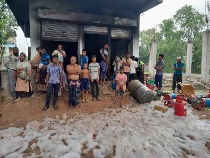 গ্যাস সিলিন্ডারে আগুন ধরে যায় এবং দাউ দাউ করে আগুন জ্বলতে থাকে ও সমস্ত