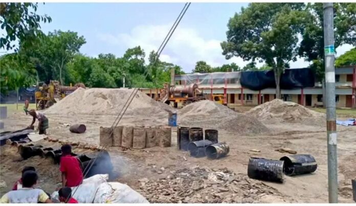 বিদ্যালয়ের মাঠ দখল করে ঠিকাদারি প্রতিষ্ঠানের এমন কর্মকাণ্ডে ক্ষুব্ধ শিক্ষক, শিক্ষার্থী, অভিভাবক ও এলাকাবাসী।