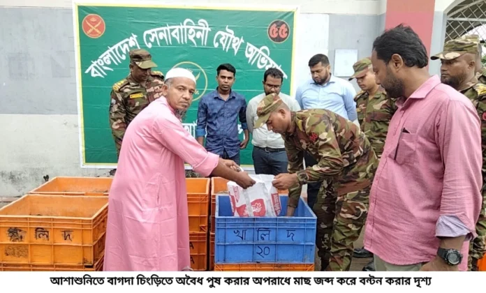 আশাশুনিতে ভ্রাম্যমান আদালতে পুষকৃত বাগদা চিংড়ি আটকের পর পুড়িয়ে ধ্বংস