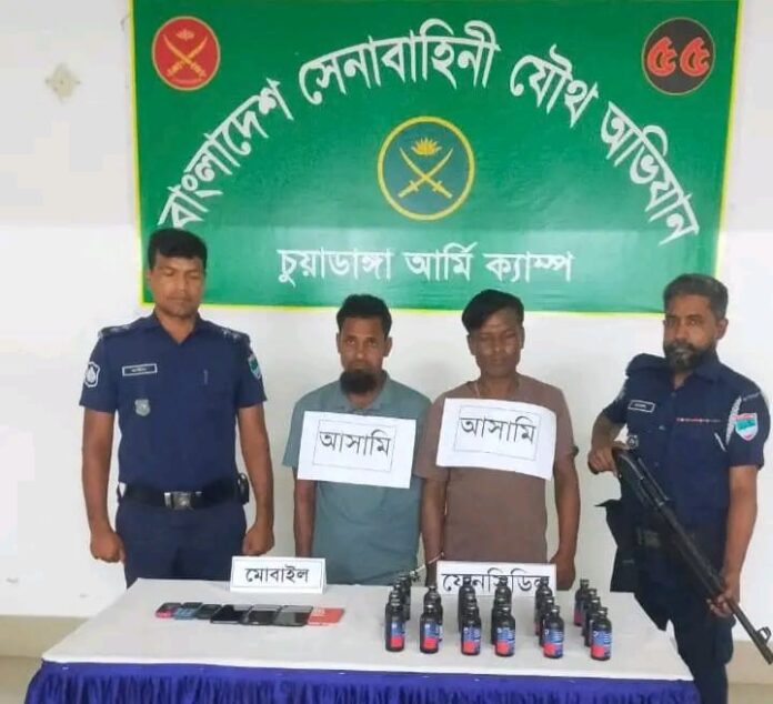 মাহমুদ হাসান রনি, দামুড়হুদা (চুয়াডাঙ্গা) প্রতিনিধিঃ চুয়াডাঙ্গার জীবননগরে সেনাবাহিনী ও পুলিশের যৌথ অভিযানে ২৩ বোতল ফেনসিডিলসহ ২ জনকে গ্রেফতার করেছে। পরে দুজনের বিরুদ্ধে মামলা হয়েছে।