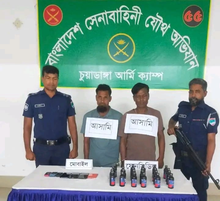 সোমবার ভোর সাড়ে ৪ টার দিকে চুয়াডাঙ্গা জেলার জীবননগরে বাংলাদেশ সেনাবাহিনী (চুয়াডাঙ্গা ক্যাম্প) এবং জীবননগর থানা পুলিশ মাদকবিরোধী অভিযান চালায়। এসময় মনোহরপুর ইউনিয়নের কালা এবং মাধবখালী এলাকায় এ অভিযান পরিচালনা করে ২৩ বোতল ফেনসিডিলসহ মনোহরপুর ইউনিয়নের কালা মাঝপাড়া গ্রামের মৃত নূর বক্সের ছেলে মনিরুল ইসলাম দুধ বারি (৪৫) এবং একই ইউনিয়নের মাধবখালী গ্রামের সাত্তার খানের ছেলে শাহজাহান আলী খান (৪২) গ্রেফতার করে। সকালে গ্রেফতারকৃতদের বিরুদ্ধে জীবননগর থানায় মাদকদ্রব্য নিয়ন্ত্রণ আইনে একটি মামলা দায়ের করা হয়েছে। জীবননগর থানার ভারপ্রাপ্ত কর্মকর্তা জানায়, মাদক নির্মূলের লক্ষ্যে এ ধরণের অভিযান অব্যাহত থাকবে।