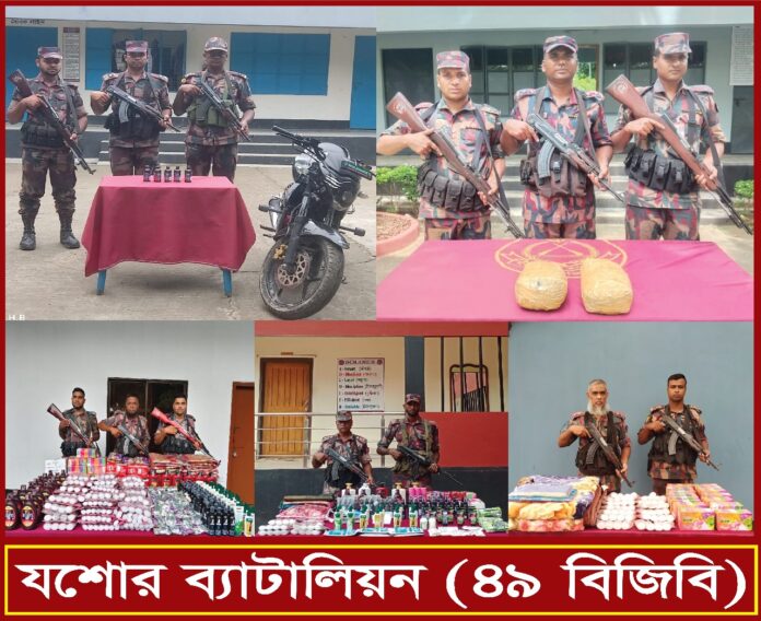 বিজিবি সূত্রে জানা যায়, বেনাপোল, পাঁচপীরতলা, রঘুনাথপুর বিওপি, বেনাপোল আইসিপি এবং আমড়াখালী চেকপোস্ট এলাকায় পরিচালিত অভিযানে ভারতীয় ফেনসিডিল, গাঁজা, মোটরসাইকেল, শাড়ি, কম্বল, থ্রিপিস, চকলেট, ওষুধ ও কসমেটিক্স সামগ্রী জব্দ করা হয়।