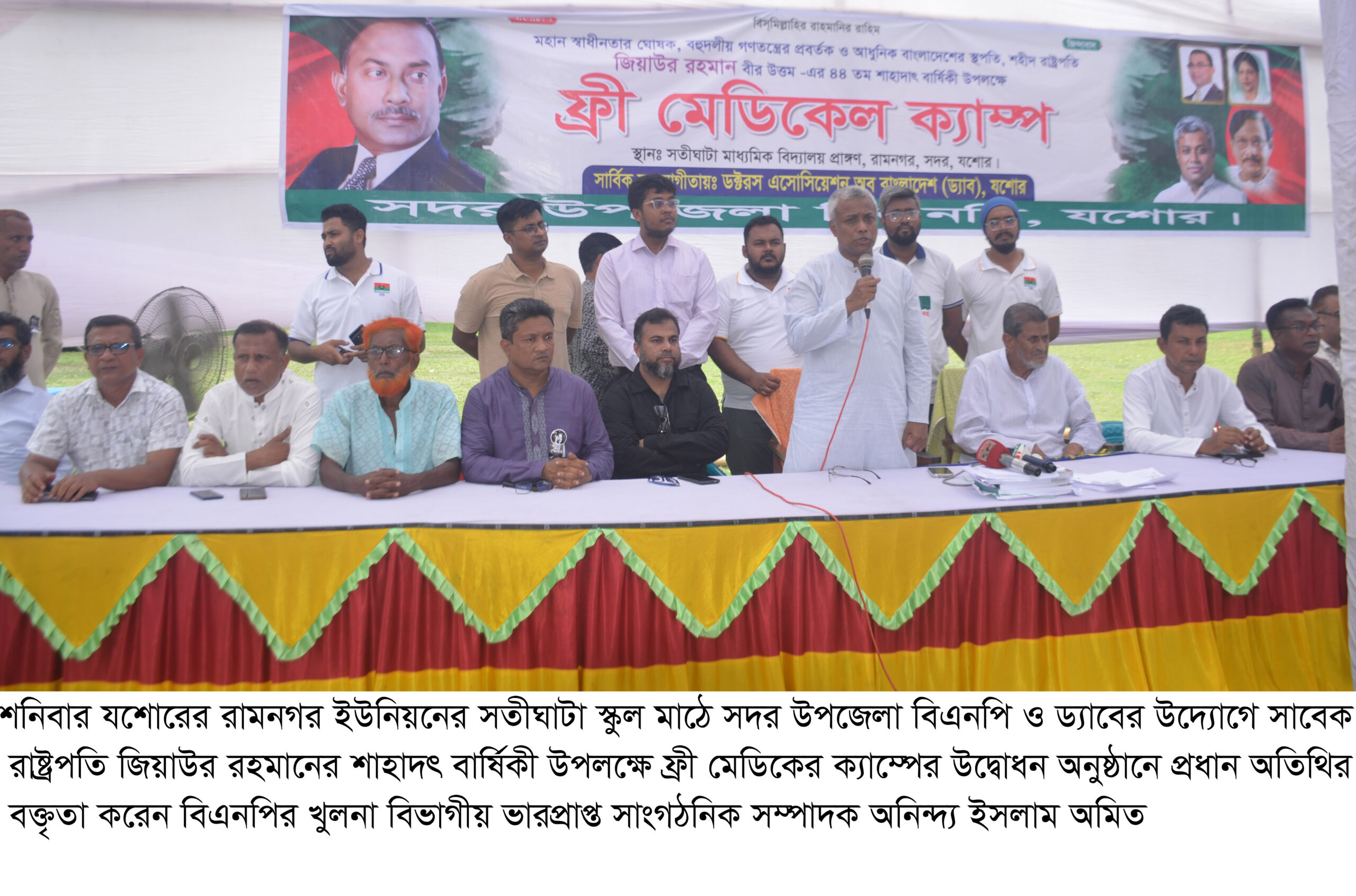 নাসির উদ্দিন নয়ন কুয়াদা যশোর প্রতিনিধি : মহান স্বাধীনতার ঘোষক বহুদলীয় গণতন্ত্রের প্রবর্তক ও আধুনিক বাংলাদেশের স্থপতি শহীদ রাষ্ট্রপতি জিয়াউর রহমান এর ৪৪ তম শাহাদাৎ বার্ষিকী উপলক্ষ্যে রামনগর ইউনিয়নে ফ্রি মেডিকেল ক্যাম্প শুভ উদ্বোধন করেন, জাতীয় নির্বাহী কমিটির খুলনা বিভাগীয় ভারপ্রাপ্ত সাংগঠনিক সম্পাদক অনিন্দ্য ইসলাম অমিত। শনিবার (৩১শে মে) দিনব্যাপি সতীঘাটা মাধ্যমিক বিদ্যালয়ের মাঠ প্রাঙ্গনে এই ফ্রি মেডিকেল ক্যাম্পের শুভ উদ্বোধন করা হয়। রামনগর ইউনিয়ন বিএনপি’র আহবায়ক ডাঃ আব্দুল আজিজ এর সভাপতিত্বে এবং সদর উপজেলা তথ্য ও গবেষণা বিষয়ক সম্পাদক মিজানুর রহমান বাবলুর সঞ্চালনায় অনুষ্ঠানে প্রধান অতিথির বক্তব্য রাখেন, জাতীয় নির্বাহী কমিটির খুলনা বিভাগীয় ভারপ্রাপ্ত সাংগঠনিক সম্পাদক অনিন্দ্য ইসলাম অমিত। বিশেষ অতিথি ইঞ্জিনিয়ার রবিউল ইসলাম সাংগঠনিক সম্পাদক জেলা বিএনপি, অধ্যাপক আব্দুর খান ভারপ্রাপ্ত সভাপতি সদর উপজেলা বিএনপি। বিশেষ অতিথি আনজারুল হক খোকন সাধারণ সম্পাদক যশোর সদর উপজেলা বিএনপি। বিশেষ অতিথি আব্দুর রহিম যুগ্ম সাধারণ সম্পাদক যশোর সদর উপজেলা বিএনপি। আরো উপস্থিত ছিলেন আব্দুর রাজ্জাক সাংগঠনিক সম্পাদক, আরশাফুল ইসলাম মিঠু সাংগঠনিক সম্পাদক, সদর উপজেলা বিএনপি, রামনগর ইউনিয়ন বিএনপি সিনিয়ার যুগ্ম আহবায়ক মারুফ হোসেন, সিরাজ মোল্লা সদস্য মাসুদুর রহমান শামীম, সদস্য সচিব রাজু আহমেদ, মাজহারুল ইসলাম রাজিব, আলমগীর হোসেন আলম, রামনগর যুবদলের সভাপতি লিটন সরদার, সাধারণ সম্পাদক আলিমুজ্জামান ডালিম, সাংগঠনিক সম্পাদক দেলোয়ার হোসেন হিমু, ছাত্রদলের সভাপতি আল মামুন সাধারণ সম্পাদক শামীম হোসেন স্বেচ্ছাসেবক দলের সভাপতি জহির হোসেন, সদস্য সচিব কৃষ্ণপদ বিশ্বাসসহ রামনগর ইউনিয়নের বিভিন্ন ওয়ার্ডের বিএনপির অঙ্গ সংগঠনের নেতৃবৃন্দরা উপস্থিত ছিলেন। ডাক্তার বিশেষজ্ঞ গণ হলেন, মেডিসিন বিশেষজ্ঞ ডাঃ দেবাশীষ দত্ত, কিডনি বিশেষজ্ঞ ডাঃ ওবায়দুল কাদির উজ্জ্বল, নিউরো মেডিসিন বিশেষজ্ঞ ডাঃ রাশেদ রেজা ও ডাঃ এ এইচ এম মনিরুজ্জামান, হৃদরোগ বিশেষজ্ঞ ডাঃ আব্দুল কাদের ও ডাঃ মোশফেক উর রহমান, বক্ষব্যাধির বিশেষজ্ঞ ডাঃ আজিম উদ্দিন, চর্মরোগ বিশেষজ্ঞ ডাঃ মিঠুন কুমার দে, শিশু বিশেষজ্ঞ ডাঃ আহমেদ ফেরদৌস জাহাঙ্গীর, ডাঃ ইকবাল হোসেন, ডাঃ মনিরুজ্জামান, গাইনী বিশেষজ্ঞ ডাঃ নার্গিস আক্তার ডাঃ শারমিন নাহার পলি, ডাঃ জেসমিন সুলতানা, ও দিলরুবা ফেরদৌস ডায়না, সার্জারী বিশেষজ্ঞ ডাঃ শফিউল আলম, ডাঃ সাঈদুর রহমান, অর্থোপেডিক বিশেষজ্ঞ ডাঃ এস এম শাহাবুল করিম ও ডাঃ ইউনুস হোসেন, নাক কান গলা বিশেষজ্ঞ ডাঃ তমিজ উদ্দিন শেখ, শিশু সার্জারী বিশেষজ্ঞ ডাঃ এম এ গোলাম কিরবিয়া ও ডাঃ মাসফিকুর রহম