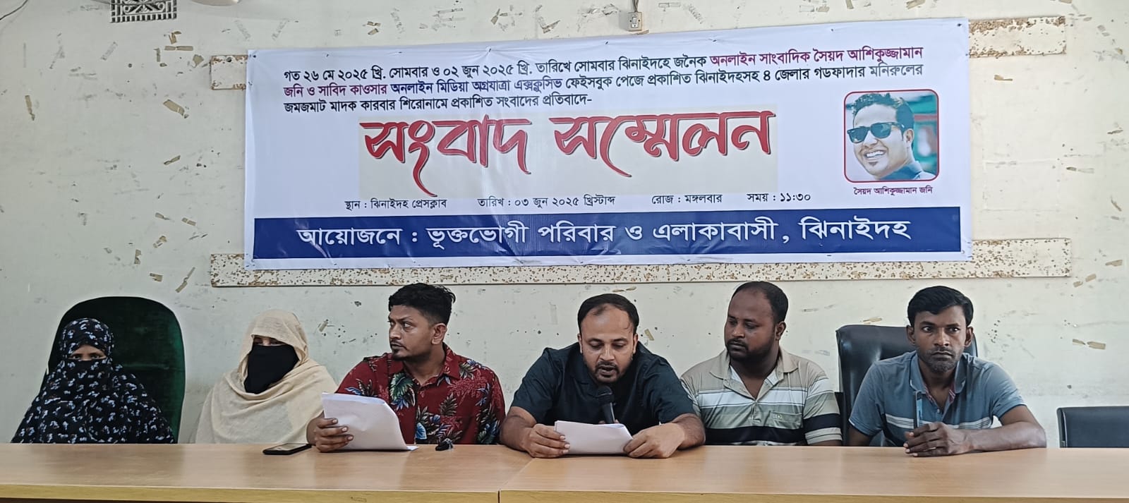 সংবাদ সম্মেলনে লিখিত বক্তব্যে বলা হয়, গত ২৬ মে ও ২ জুন অগ্রযাত্রা এক্সক্লুসিভ নামে একটি ফেসবুক পেজে “ঝিনাইদহসহ চার জেলার গডফাদার মনিরুলের জমজমাট মাদক কারবার” হেডলাইন দিয়ে ভুয়া, মিথ্যা ও অসত্য প্রচার চালানো হয়। এই খবরে তার প্রবাসী ভাই এবং অসুস্থ মাকে জড়িয়ে মিথ্যাচার করা হয়। তার ভাই উজ্জল ১৮ বছর ধরে প্রবাসে থাকলেও তিনি ক্সবাজারে থেকে মাদকের চালান পরিচালনা করছেন বলে মিথ্যা ও ভিত্তিহীন অপপ্রচার করা হয়। সংবাদ সম্মেলনে বলা হয়, তাদের প্রভাব প্রতিপত্তি ও আভিজাত্য সর্বশেষ ইউপি নির্বাচন করার ঘোষনায় এলাকার কিছু কুচক্রি মহল ঈর্ষানিত হয়ে সৈয়দ আশিকুজ্জামান জনি ও সাবিদ কাওসার নামে দুই সাইবার দুর্বৃত্ত দিয়ে এমন অসত্য অপপ্রচার চালিয়ে যাচ্ছে।