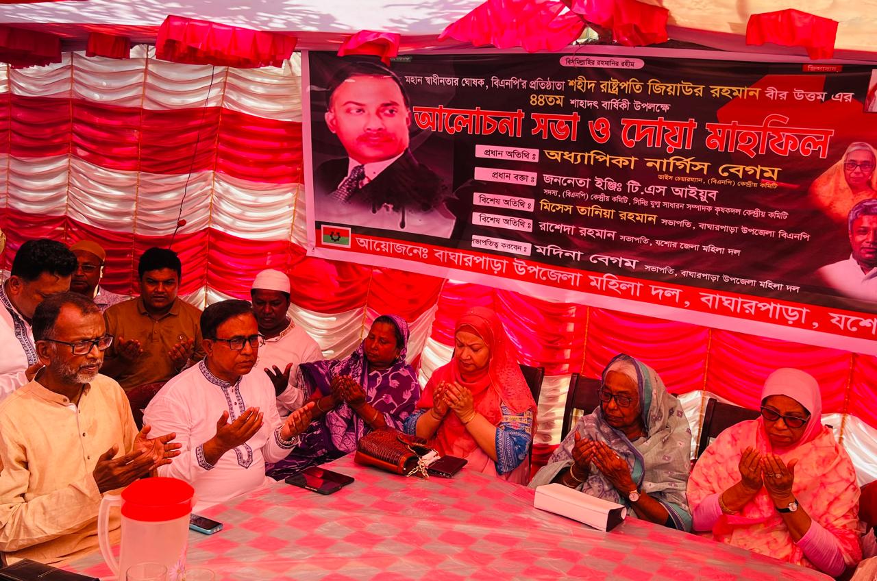 শুক্রবার বিকেলে যশোরের বাঘারপাড়া উপজেলা মহিলা দল জহুরপুর ইউনিয়নের যাদবপুরে এ অনুষ্ঠানের আয়োজন করে। উপজেলা মহিলা দলের সভাপতি মদিনা বেগমের সভাপতিত্বে অনুষ্ঠানে প্রধান বক্তা ছিলেন, বিএনপির কেন্দ্রীয় সদস্য ও কৃষক দলের সিনিয়র যুগ্ম সাধারণ সম্পাদক ইঞ্জিনিয়ার টিএস আইয়ূব। বিশেষ অতিথি ছিলেন, বাঘারপাড়া উপজেলা বিএনপির সভাপতি তানিয়া রহমান, সাধারণ সম্পাদক শামছুর রহমান, জেলা মহিলা দলের সভাপতি রাশেদা রহমান, সাধারণ সম্পাদক ফেরদৌস বেগম ও সাংগঠনিক সম্পাদক আনোয়ারা পারভীন। এ সময় অন্যদের মধ্যে উপস্থিত ছিলেন, বাঘারপাড়া পৌর বিএনপি সাধারণ সম্পাদক আব্দুর রহমান মিন্টু, সাংগঠনিক ইকলাছুর রহমান, জহুরপুর ইউনিয়নের সাবেক চেয়ারম্যান মোস্তফা কামাল, ইউনিয়ন বিএনপির সভাপতি কাজী মনিরুজ্জামান, সাধারণ সম্পাদক আবু তালেব, বন্দবিলা ইউনিয়নের সসভাপতি মনিরুজ্জামান তপন, সাধারণ সম্পাদক আজিজুল ইসলাম, সিনিয়র সহসভাপতি আনোয়ার হোসেন ভুট্রো, নারিকেলবাড়িয়া ইউনিয়ন বিএনপির সাধারণ সম্পাদক মোস্তফা সিকদার, উপজেলা কৃষক দলের সভাপতি মশিউল আযম, জেলা স্বেচ্ছাসেবক দলের যুগ্ম আহবায়ক শামীম আকতার, বাঘারপাড়া উপজেলা স্বেচ্ছাসেবক দলের সদস্য সচিব জাকির হোসেন সুদ প্রমুখ। আলোচনা সভা শেষে দোয়া মাহফিলে মোনাজাত পরিচালনা করেন, যাদবপুর হাফেজিয়া মাদরাসা ও এতিমখানার মুহতামীম হাফেজ মোয়াজ্জেম হোসেন।