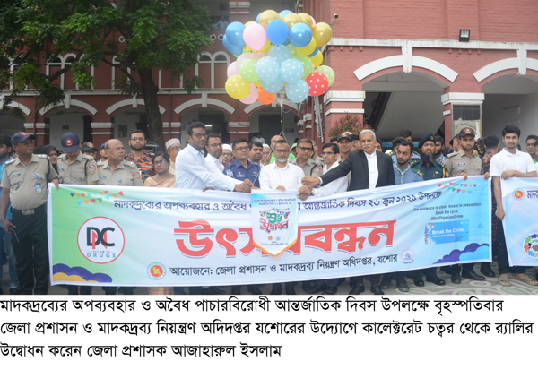 স্টাফ রিপোর্টার : নানা আয়োজনে যশোরে মাদকদ্রব্যের অপব্যবহার ও অবৈধ পাচা বিরোধী আন্তর্জাতিক দিবস উদযাপন করা হয়েছে। অনুষ্ঠানের মধ্যে ছিল র্যালি, আলোচনা ও পুরস্কার বিতরণ। জেলা প্রশাসন ও মাদকদ্রব্য নিয়ন্ত্রণ অধিদপ্তরের উদ্যোগে কালেক্টরেট সভাকক্ষ অমিত্রাক্ষরে বৃহস্পতিবার সকালে আলোচনা সভার আয়োজন করা হয়। প্রধান অতিথির বক্তব্য রাখেন জেলা প্রশাসক আজাহারুল ইসলাম। তিনি বলেন, মাদকের কোন উপকার নেই। বরং মানুষকে ধ্বংস করে । এটা থামানোর জন্য বিভিন্ন পদক্ষেপ নিতে হচ্ছে। যুব সমাজকে মাদক থেকে দূরে রাখতে পরিবার ও শিক্ষা প্রতিষ্ঠান থেকে প্রতিরোধ গড়ে তুলতে হবে। বিশেষ অতিথির বক্তব্য রাখেন অতিরিক্ত পুলিশ সুপার নূর-ই-আলম সিদ্দিকী, ডেপুটি সিভিল সার্জন ডাক্তার নাজমুস সাদিক। অতিরিক্ত জেলা ম্যাজিস্ট্রেট কমলেশ মজুমদারের সভাপতিত্বে বক্তব্য রাখেন ও তথ্য উপস্থাপন করেন জেলা মাদক দ্রব্য নিয়ন্ত্রণ অধিদপ্তরের উপপরিচালক আসলাম হোসেন। বক্তব্য রাখেন গণপর্ত অধিদপ্তরের নির্বাহী প্রকৌশলী জাহিদুল ইসলাম, মাদক থেকে স্বাভাবিক জীবনে ফিরে কামরুল ইসলাম প্রমুখ। অনুষ্ঠান পরিচালনা করেন সরকারি বালিকা উচ্চ বিদ্যালয়ের সিনিয়র শিক্ষক আহসান হাবীব পারভেজ। আলোচনা শেষে রচনা ও চিত্রাঙ্কন প্রতিযোগিতায় বিজয়ী ২১ শিক্ষার্থীর মাঝে পুরস্কার বিতরণ করা হয়। এর আগে কালেক্টরেট চত্বর থেকে র্যালি বের করা হয়। প্রধান অতিথি হিসেবে বেলুন ও ফেস্টুন উড়িয়ে র্যালির উদ্বোধন করেন জেলা প্রশাসক আজাহারুল ইসলাম। উপস্থিত ছিলেন অতিরিক্ত জেলা ম্যাজিস্ট্রেট কমলেশ মজুমদার অতিরিক্ত পুলিশ সুপার নূর-ই-আলম সিদ্দিকী, ডেপুটি সিভিল সার্জন ডাক্তার নাজমুস সাদিক, জেলা আইনজীবী সমিতির সভাপতি আবু মোর্তজা ছোট, জেলা মাদকদ্রব্য নিয়ন্ত্রণ অধিদপ্তরের উপপরিচালক আসলাম হোসেন। বক্তব্য রাখেন গণপর্ত অধিদপ্তরের নির্বাহী প্রকৌশলী জাহিদুল ইসলাম প্রমূখ।