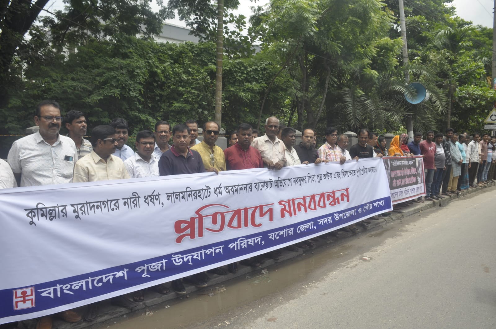 যশোর অফিস : কুমিল্লার মুরাদনগরে এক নারীকে ধর্ষণ ও নিগ্রহের ঘটনার প্রতিবাদে এবং দোষীদের দৃষ্টান্তমূলক শাস্তির দাবিতে যশোরে মানববন্ধন অনুষ্ঠিত হয়েছে। সোমবার সকাল ১১টায় যশোর প্রেসক্লাবের সামনে বাংলাদেশ পূজা উদযাপন পরিষদ যশোর জেলা শাখা এ মানববন্ধনের আয়োজন করে।