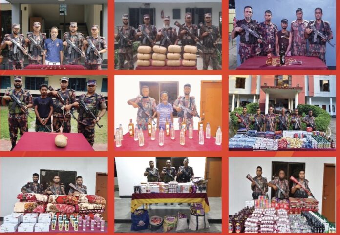 বিজিবি জানায়, যশোর ৪৯ বিজিবি ব্যাটালিয়নের আওতাধীন বেনাপোল বিওপি, আইসিপি, আমড়াখালী চেকপোস্টসহ বিভিন্ন এলাকায় অভিযান চালিয়ে স্বর্ণ, বিদেশি মদ, ফেনসিডিল, গাঁজা, নেশাজাতীয় ট্যাবলেট, ভারতীয় শাড়ি, পোশাক, চকলেট, কসমেটিকসসহ নানা ধরনের পণ্য জব্দ করা হয়।