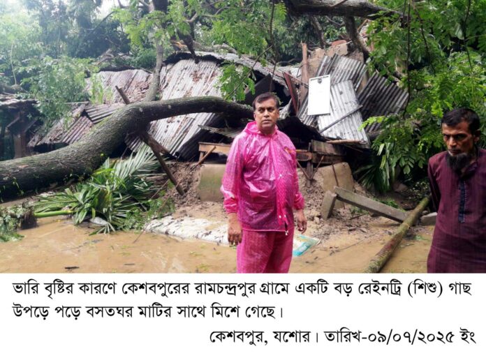 প্রতিবেশী এক ব্যক্তির একটি বড় রেইনট্রি (শিশু) গাছ উপড়ে পড়ায় বসতঘরটি মাটির