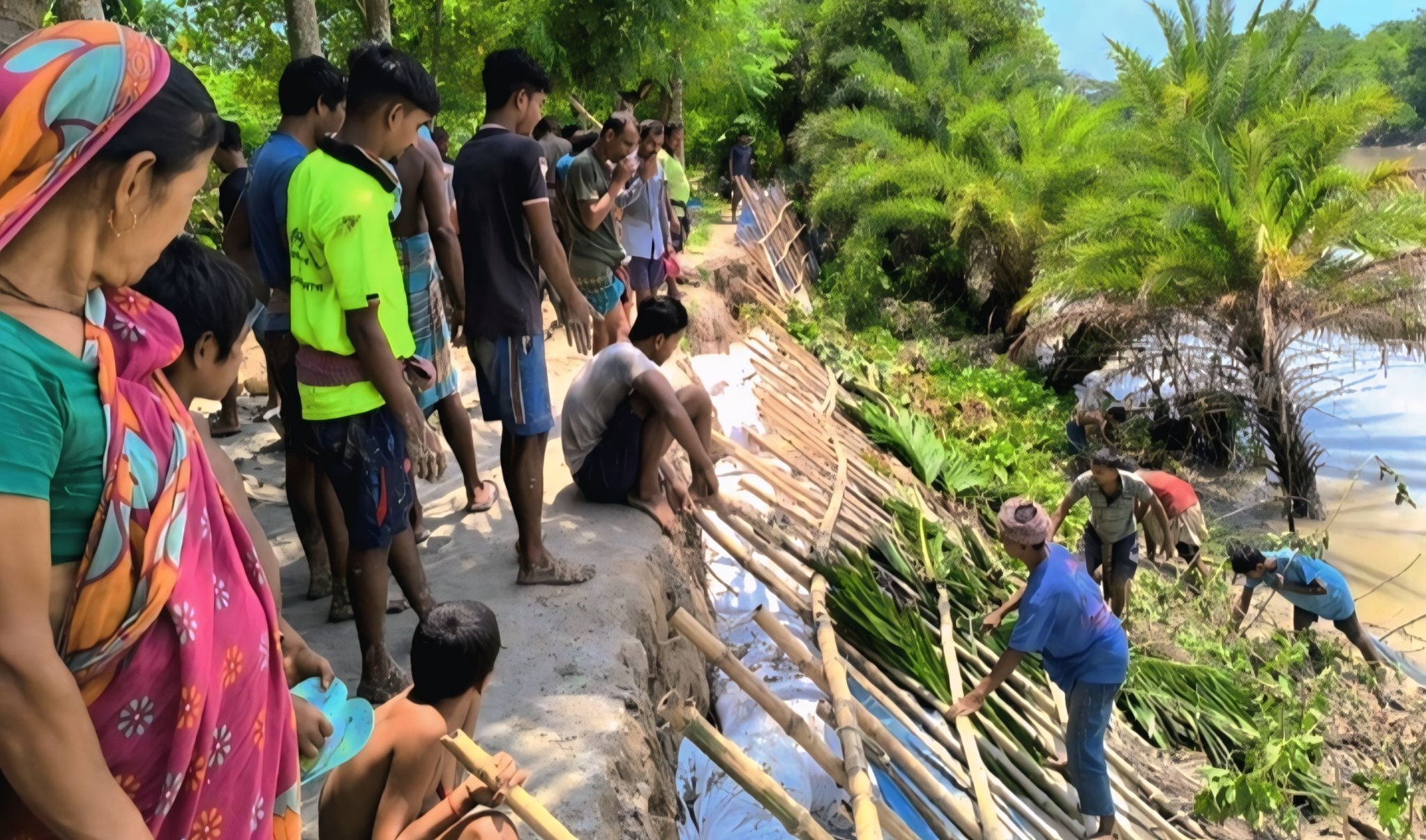 উপজেলা প্রশাসন ও পানি উন্নয়ন বোর্ড বাঁধ সংস্কারে কোনো উদ্যোগ না নেওয়ায় গ্রামবাসী স্বেচ্ছাশ্রমে এই কাজ করেছেন।