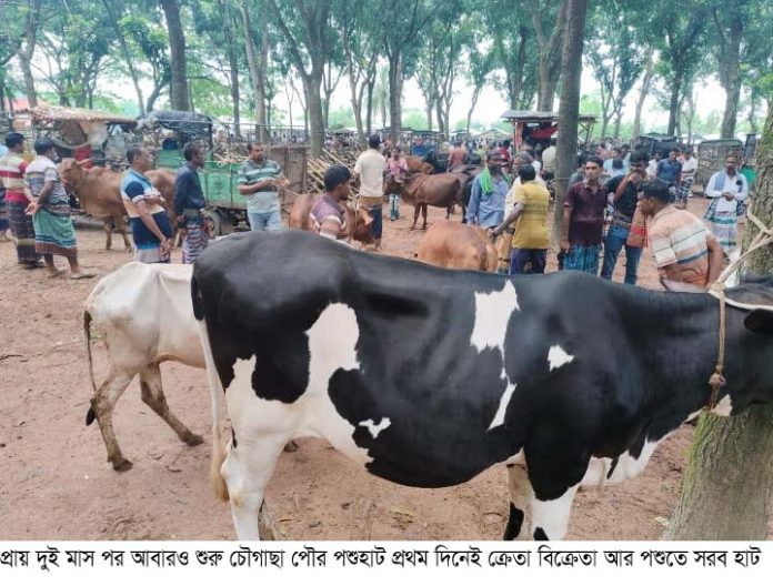 দুইমাস বন্ধ থাকার পর শুক্রবার শুরু হয়েছে চৌগাছার পশুহাট ক্রেতা বিক্রেতায় সরব