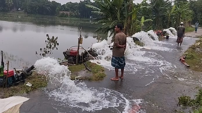 অতিরিক্ত বৃষ্টির কারণে সৃষ্ট জলাবদ্ধতা থেকে ফসলি জমিকে বাঁচাতে নিজেরাই অর্থ খরচ করে সেচপাম্প লাগিয়ে পানি অপসারণ করছেন বলে জানিয়েছেন স্থানীয় কৃষকেরা।