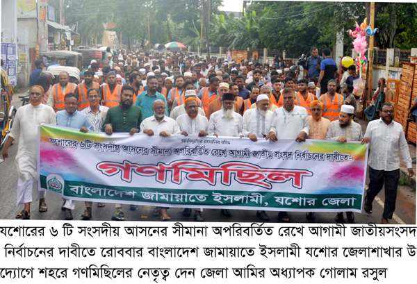 যশোরের ৬ টি সংসদীয় আসনের সীমানা অপরিবর্তিত রেখে আগামী জাতীয় সংসদ নির্বাচনের দাবীতে বাংলাদেশ জামায়াতে ইসলামী যশোর জেলা শাখার উদ্যোগে শহরে সমাবেশ ও গণমিছিল অনুষ্ঠিত হয়।