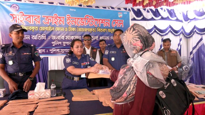 মেহেরপুর প্রতিনিধি : থানায় একটি মাত্র জিডি হারানো মুঠোফোন ও ভূলক্রমে মোবাইল ব্যাংকিংয়ে চলে যাওয়া টাকা ফেরত পাচ্ছেন ভূক্তভোগীরা। মেহেরপুরের তিন উপজেলা থেকে একশো ২২ টি হারানো মুঠোফোন ও নগদ ১০ লাখ ১৮ হাজার ৩শ টাকা উদ্ধার করেছে সাইবার ক্রাইম ইনভেস্টিগেশন সেল। সোমবার (২৫ আগস্ট) দুপুরে পুলিশ সুপার কার্যালয়ে ভূক্তভোগীদের হাতে এসব মুঠোফোন ও নগদ টাকা হস্তান্তর করেন পুলিশ সুপার সাকসুদা আক্তার খানম।