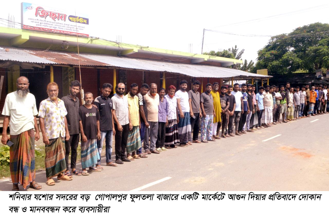 যশোরে ব্যবসায়িক প্রতিষ্ঠানে আগুন ধরিয়ে দেওয়ার ঘটনার প্রতিবাদে বিক্ষুব্ধ ব্যবসায়ীরা