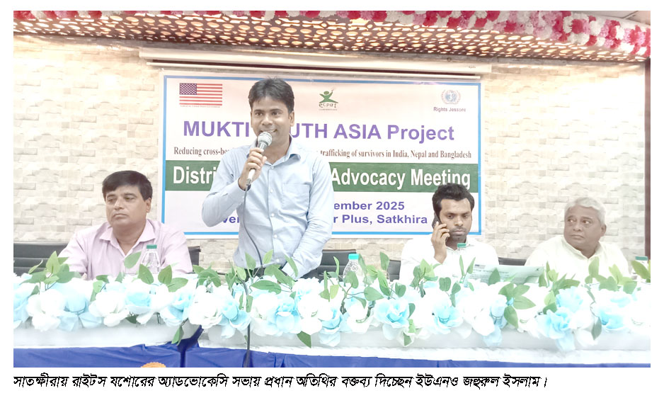 প্রেস বিজ্ঞপ্তি:মুক্তি দক্ষিণ এশিয়া প্রকল্পের ভারত, নেপাল ও বাংলাদেশ আন্ত:সীমান্ত শিশু যৌন পাচার এবং বেচে যাওয়া ব্যক্তিদের পুন:পাচর হ্রাস বিষয়ে জেলা পযায়ে যৌথ অ্যাডভোকেসি সভা অনুষ্ঠিত হয়েছে। বৃহস্পতিবার (৪সেপ্টেম্বর) ২০২৫ সকাল ১০ টার দিকে রাইটস যশোর সংস্থার মুক্তি সাউথ এশিয়া প্রকল্প কর্তৃক আয়োজিত সাতক্ষীরার হোটেল টাইগার প্লাস এর সম্মেলন কক্ষে ওই অ্যাডভোকেসি সভা অনুষ্ঠিত হয়। উক্ত সভায় সভাপতিত্ব করেন-যশোর রাইটস এর নির্বাহী পরিচালক বিনয় কৃষ্ণ মল্লিক। অনুষ্ঠানে প্রধান অতিথি হিসেবে উপস্থিত থেকে বক্তব্য দেন- কলারোয়া উপজেলা নির্বাহী অফিসার জহুরুল ইসলাম। বিশেষ অতিথি হিসাবে উপস্থিত ছিলেন ও বক্তব্য দেন-সাতক্ষীরা সদর উপজেলা নির্বাহী অফিসার শোয়াইব আহমেদ, জেলা মহিলা বিষয়ক এর উপ-পরিচালক নাজমুন নাহার (অতি দা:), সমাজসেবা অধিদপ্তরের উপ-পরিচালক সন্তোষ কুমার নাথ, জেলা মাধ্যমিক শিক্ষা অফিসার আবুল খায়ের, কলারোয়া উপজেলা মহিলা বিষয়ক কর্মকর্তা নুরুন নাহার আক্তার। এছাড়া অন্যদের মধ্যে উপস্থিত ছিলেন-রাইটস যশোরের মুক্তি সাউথ এশিয়া প্রকল্পের পোগ্রাম অফিসার মোঃ সাইফুল ইসলাম প্রমুখ।