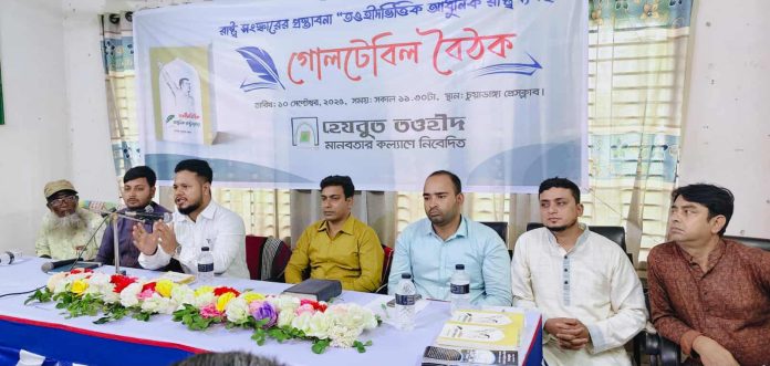 বৈঠকে মূল প্রবন্ধ উপস্থাপন করেন কেন্দ্রীয় কার্যনির্বাহী কমিটির সদস্য মোখলেছুর রহমান সুমন। এসময় প্রবন্ধ উপস্হাপক তওহীদভিত্তিক রাষ্ট্রব্যবস্হার রূপরেখা তুলে ধরেন।বৈঠকে বিশেষ অতিথি হিসেবে উপস্থিত ছিলেন সংগঠনের খুলনা বিভাগীয় আমীর তানভীর আহম্মেদ, চুয়াডাঙ্গা সদর থানার সভাপতি আতিয়ার রহমান, দামুড়হুদা থানার সভাপতি কিনারুল ইসলাম, দর্শনা থানার সভাপতি আব্দুর রহমান, জীবননগর থানা সভাপতি আলী কদর ও আলমডাঙ্গা থানা সভাপতি আসাবুজ্জামান,মুর্শিদ আলী প্রমুখ। গোলটেবিল বৈঠকে সাংবাদিক ও হেযবুত তওহীদের নেতৃবৃন্দ উপস্থিত ছিলেন।খুলনা বিভাগীয় আমীর তানভীর আহম্মেদ বলেন “আল্লাহর দেওয়া জীবনব্যবস্থা প্রতিষ্ঠা করে রসুল (সা.) এমন নিরাপদ সমাজ গঠন করেছিলেন যে, একা একজন নারী রাতের অন্ধকারে নির্ভয়ে শত শত মাইল পথ হেঁটে যেত। মানুষ ঘরের দরজা খুলে ঘুমাতে পারত। স্বর্ণের দোকান খোলা রেখে মসজিদে যেত। আদালতে মাসের পর মাস অপরাধ-সংক্রান্ত মামলা আসত না।”আল্লাহর দেওয়া সেই চিরন্তন জীবনব্যবস্থাকেই আধুনিক প্রেক্ষাপটে তুলে ধরতে হবে সকলের মাঝে। তওহীদের ভিত্তিতে আধুনিক রাষ্ট্রনীতি, রাজনৈতিক দল, বিচারব্যবস্থা, মসজিদ ব্যবস্থা, প্রতিরক্ষা ব্যবস্থা, আইন-শৃঙ্খলা রক্ষাকারী বাহিনী, গণমাধ্যম, মন্ত্রিপরিষদ, নারীর মর্যাদা ও ভূমিকা, আইনসভা, সামাজিক সুরক্ষা ইত্যাদি কেমন হবে তার একটি পূর্ণাঙ্গ চিত্র উঠে আসে।