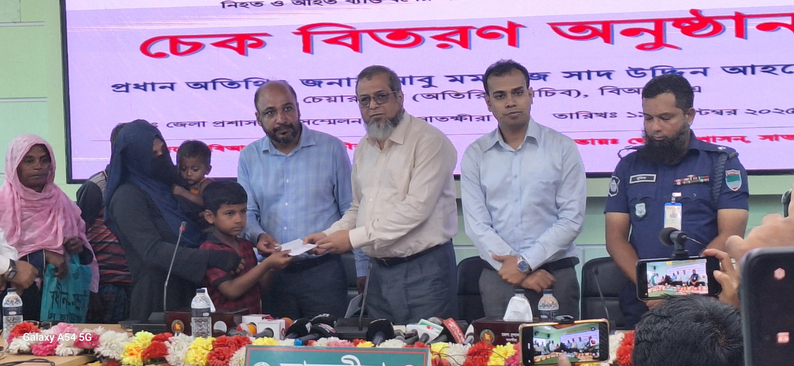 শেখ আমিনুর হোসেন, সাতক্ষীরা: সাতক্ষীরায় সড়ক দুর্ঘটনায় নিহত ৫জন ও আহত একজনের পরিবারের অনুকুলে মঞ্জুরিকৃত অর্থের চেক বিতরণ করা হয়েছে। শুক্রবার (১৯ সেপ্টেম্বর ‘২৫) সকাল ১০টায় সাতক্ষীরা জেলা প্রশাসকের সম্মেলন কক্ষে প্রধান অতিথি হিসেবে উপস্থিত থেকে এ চেক বিতরণ করেন বাংলাদেশ রোড ট্রান্সপোর্ট অথরিটি (বিআরটিএ) এর চেয়ারম্যান মোঃ আবু মমতাজ সাদ উদ্দিন আহমেদ।