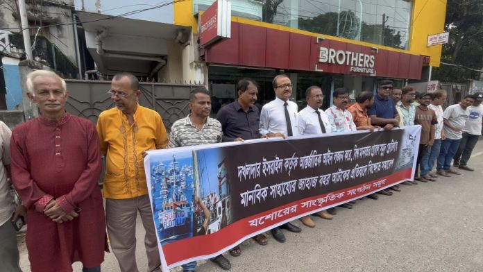 যশোর স্পেশাল গ্লোবাল সুমুদ ফ্লোটিলার জাহাজ বহর আটকের প্রতিবাদে যশোরে সাংস্কৃতিক সংগঠনগুলোর মানববন্ধন