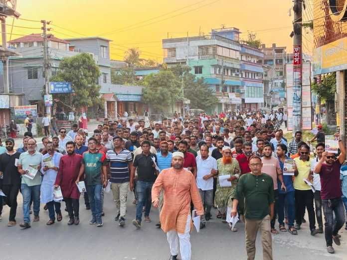 নড়াইল শহরে লিফলেট বিতরণ ধানের শীষের প্রচার মিছিল ও পথসভা অনুষ্ঠিত হয়েছে।