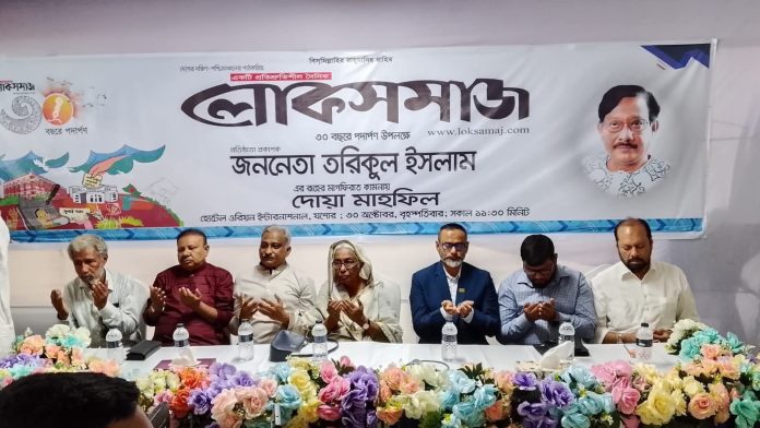 দোয়া মাহফিল পূর্ব সংক্ষিপ্ত আলোচনা সভায় দৈনিক লোকসমাজ সম্পাদক, বিশিষ্ট শিক্ষাবিদ অধ্যাপক নার্গিস বেগম বলেন, ‘পত্রিকাটি ২৯ বছর পূর্ণ করে ৩০ বছরে পদার্পণ করেছে। একটি একটি করে দিন পার করে এই ২৯টি বছর অতিক্রান্ত হয়েছে। এই সময়গুলো কেমন ছিল, যারা পেরিয়েছে তারাই জানে। এই ২৯ বছরের অর্ধেকেরও বেশি সময় লোকসমাজ বৈরী পরিস্থিতি মোকাবিলা করেছে, উজান স্রোতে চলেছে। তিনি বলেন, যে উদ্দেশ্য ও স্বপ্ন নিয়ে তরিকুল ইসলাম পত্রিকাটি প্রতিষ্ঠা করেছিলেন, সেটিও এক উত্তাল সময় ছিল। দেশে তখন অরাজকতা সৃষ্টির প্রচেষ্টা চলছিল, মতপ্রকাশের প্রায় সব পথ বন্ধ হতে চলেছিল। সেই সময়ে তিনি সাহসিকতার সঙ্গে মানুষের কথা বলার প্রয়োজনে লোকসমাজ প্রকাশ করেছিলেন। তিনি ছিলেন নিঃসঙ্গ এক শেরপা, যিনি তাঁর লক্ষ্য থেকে বিচ্যুত হননি। রাজনৈতিক মতভেদ বা সামাজিক বিভাজনকে উপেক্ষা করে পত্রিকাটি সবসময় আসল কথাটি বলার চেষ্টা করেছে। এজন্য আমরা অসংখ্য শুভানুধ্যায়ীদের ভালোবাসা পেয়েছি। ১৯৯৬ সালে শেখ হাসিনার সরকার গঠনের পর নির্যাতনের মুখে পত্রিকাটি বন্ধ হওয়ার উপক্রম হলে পাঠক ও শুভানুধ্যায়ীরাই পাশে দাঁড়িয়েছিলেন। সম্পাদক বলেন, আমরা নানা বৈরী সময় পার করেও সেই পথ ধরে চলেছি। সাংবাদিক ও কর্মচারীদের আন্তরিক প্রচেষ্টায় লোকসমাজ টিকে আছে। এমনকি ১/১১-এর সময়, যখন প্রতিষ্ঠাতা প্রকাশক অসুস্থ অবস্থায় কারাগারে ছিলেন, তখনও লোকসমাজ-এর প্রকাশনা বন্ধ হয়নি। আমরা গর্বিত যে, মানুষের কথা বলার এই ধারাবাহিকতা আজও অটুট রয়েছে। আগামীতেও সকলের সহযোগিতা পেলে সত্য ও বস্তুনিষ্ঠ সংবাদ পরিবেশনের এই ধারা অব্যাহত রাখব। জেলা প্রশাসক মো. আজহারুল ইসলাম বলেন, ‘লোকসমাজ পাঠকনন্দিত বলেই দীর্ঘ ৩০ বছর ধরে টিকে আছে। পাঠকের ভালোবাসা অর্জনের মূল কারণই প্রতিষ্ঠাতা প্রকাশক তরিকুল ইসলামের মনন, চরিত্র ও জনকল্যাণে তাঁর নিবেদিতপ্রাণতা। তাঁর সেই মানসিকতাই পত্রিকার প্রকাশনাকেও প্রভাবিত করেছে। কঠিন সময় পার করেও লোকসমাজ মানুষের কথা বলার জায়গা ধরে রাখতে পেরেছে। আমি লোকসমাজ-এর ৩০ বছরের পদার্পণে শুভেচ্ছা জানাই। আগামীর দিনগুলো আরও সুন্দর হোক, পত্রিকাটি মানুষের ও সমাজের কথা বলুক।’ পত্রিকার প্রকাশক শান্তনু ইসলাম সুমিত প্রতিষ্ঠাতা প্রকাশক তরিকুল ইসলামকে শ্রদ্ধাভরে স্মরণ করে বলেন, লোকসমাজ এর অসংখ্য পাঠক, লেখক, গ্রাহক, সাংবাদিক, কর্মকর্তা-কর্মচারী, হকার ও এজেন্টদের আমরা কৃতজ্ঞ। দুঃসময়ে তারা কখনো আমাদের ছেড়ে যায়নি। পরে প্রতিষ্ঠাতা প্রকাশক ও যশোর উন্নয়নের কর্ণধার খ্যাত তরিকুল ইসলামের আত্মার মাগফিরাত কামনায় দোয়া ও মোনাজাত করা হয়। দোয়া মাহফিলে উপস্থিত ছিলেন, যশোর স্থানীয় সরকার বিভাগের উপপরিচালক রফিকুল হাসান, সিভ