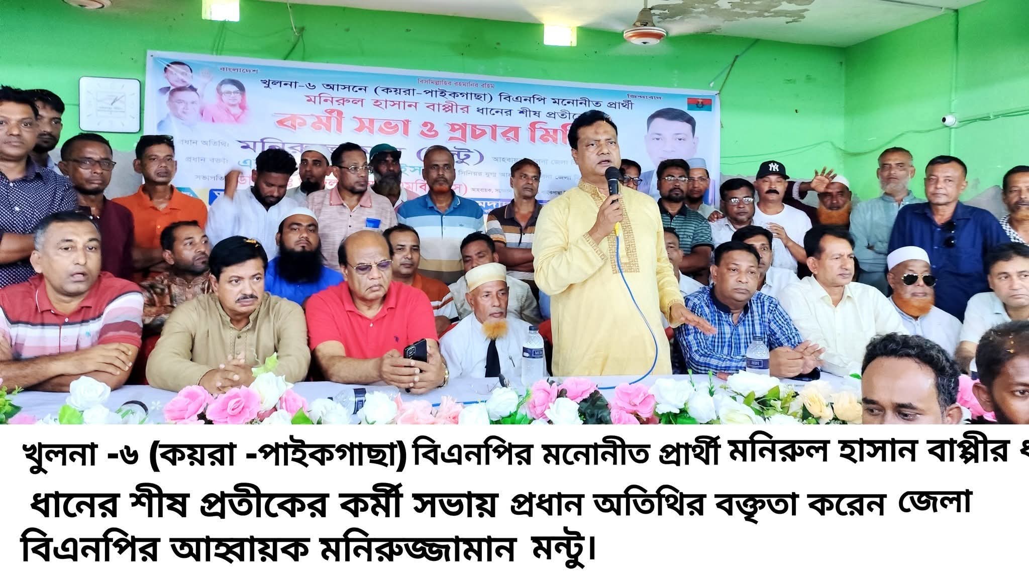 ধানের শীষ প্রতীকের প্রচার মিছিল ও কর্মী সভায় জেলা বিএনপির আহ্বায়ক মোঃ মনিরুজ্জামান মন্টু বলেন, নির্বাচনকে বানচাল করতে একটি মহল পিআর থেকে শুরু করে বিভিন্ন দাবি দাওয়া নিয়ে রাজপথে শান্ত বাংলাদেশ কে অশান্ত করতে চাই। ২৪ এর ৫ আগস্ট দেশের পট পরিবর্তন হলেও এখনো আশঙ্কা মুক্ত নয়। আগামী দিনে ধানের শীষ প্রতীককে বিজয়ী করতে হলে আমাদের মধ্যে সকল দ্বিধাদ্বন্দ্ব ভুলে যান। ক্ষুদ্র পরিসরে যারা দলকে বিভেদ সৃষ্টি করছেন তারা বঙ্গোপসাগরে হাবুডুবু খাবেন। বিএনপি সরকার গঠন করতে না পারলে ১৭ বছরে যে নির্যাতনের শিকার হয়েছেন তার ১০ গুণ নির্যাতনের শিকার হবেন। আমাদের অবহেলিত এ অঞ্চলের উন্নয়ন কর্মকাণ্ড করতে হলে ধানের শীষ প্রতীক কে বিজয়ী করতে হবে। বৃহস্পতিবার সকালে পাইকগাছা প্রেসক্লাব মিলনায়তনে উপজেলা বিএনপির সম্মেলন প্রস্তুতি কমিটির আহ্বায়ক ডাঃ আব্দুল মজিদ এর সভাপতিত্বে অনুষ্ঠিত কর্মী সম্মেলনে প্রধান অতিথির বক্তৃতায় মন্টু এসব কথা বলেন। এসময় জেলা, উপজেলা ও পৌরসভার বিভিন্ন পর্যায়ের নেতাকর্মীরা ধানের শীষের এমপি প্রার্থী মনিরুল হাসান বাপ্পীকে ধানের শীষের তোড়া ও ফুলেল শুভেচ্ছা জানান। বিশেষ অতিথি ছিলেন উপজেলা বিএনপির সাবেক সভাপতি অ্যাড. জিএ সবুর, জিয়াউর রহমান ফাউন্ডেশনের ডাইরেক্টর আমিরুল ইসলাম কাগজী, জেলার সাবেক যুগ্ম আহ্বায়ক শেখ আব্দুর রশীদ, আশরাফুল হক নান্নু, সদস্য অ্যাড. আব্দুস সাত্তার ও সাবেক ইউপি চেয়ারম্যান শাহাদাৎ হোসেন ডাবলু, অ্যাড. আবু সাঈদ, রূপসার আহ্বায়ক ম্যোল্লা সাইফুল রহমান, সদস্য জাবেদ হোসেন মল্লিক, জাসসের সদস্য সচিব একে আসাদ, মাহবুবর রহমান লোটাস। পৌর বিএনপির সভাপতি আসলাম পারভেজ, উপজেলা সদস্য সচিব এসএম ইমদাদুল হক ও পৌর সদস্য সচিব কামাল আহমেদ সেলিম নেওয়াজ এর সঞ্চালনায় বক্তৃতা করেন, বিএনপি নেতা নাদিমুজ্জামান জনি, মফিজ ম্যোল্লা, জনি, ইমাদুল ইসলাম, তহিদুজ্জামান মুকুল, আবুল হোসেন, সাজ্জাদ হোসেন, বেনজির আহমেদ, আবু তালেব, অ্যাড. একরামুল হক, ফারুক আহমেদ, স্বরজিৎ ঘোষ, সুজিত মন্ডল, মেছের আলী, নাজির আহমেদ, ইমরান সরদার সহ বিএনপি ও সকল অঙ্গ সহযোগী সংগঠনের নেতাকর্মীরা।