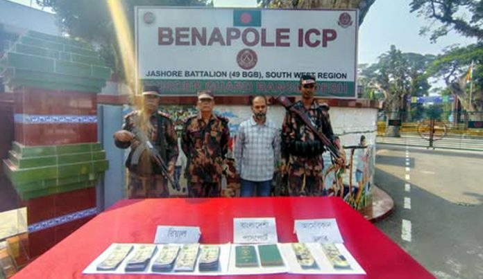 বেনাপোল প্রতিনিধি : বেনাপোলে ভারত থেকে বাংলাদেশে ডলার ও সৌদি রিয়াল পাচারের সময় প্রায় অর্ধ কোটি টাকার সমপরিমাণ বৈদেশিক মুদ্রাসহ এক যাত্রীকে আটক করেছে বর্ডার গার্ড বাংলাদেশ (বিজিবি)। শুক্রবার (২১ নভেম্বর) সকাল ৮টা ২০ মিনিটে ৪৯ বিজিবির বেনাপোল আইসিপি টহলদল এ অভিযান পরিচালনা করে। আটক শফিকুল ইসলাম ঢাকার লালবাগের হরনাথ ঘোষ রোডের সিরাজুল ইসলামের ছেলে। বিজিবি জানায়, গোপন সংবাদের ভিত্তিতে স্ক্যানিং রুমে তল্লাশির সময় ভারত ফেরত যাত্রী শফিকুল ইসলামের ব্যাগ থেকে বিশেষ কায়দায় লুকানো ১০ হাজার মার্কিন ডলার ও ১ লাখ ১০ হাজার সৌদি রিয়াল উদ্ধার করা হয়। যার আনুমানিক মূল্য ৪৮ লাখ ২০ হাজার টাকা। জিজ্ঞাসাবাদে শফিকুল জানান, ব্যবসায়িক কাজে ভারতে গিয়ে কলকাতায় অবস্থানকালে লিটু নামে এক বাংলাদেশি নাগরিক তার কাছে মুদ্রাগুলো দেন। দেশে ফেরার পর আরেক ব্যক্তি ফোনে মুদ্রা সংগ্রহ করার কথা ছিল। এ ঘটনায় বেনাপোল পোর্ট থানায় মামলার পর তাকে আদালতে সোপর্দ করা হয়েছে।
