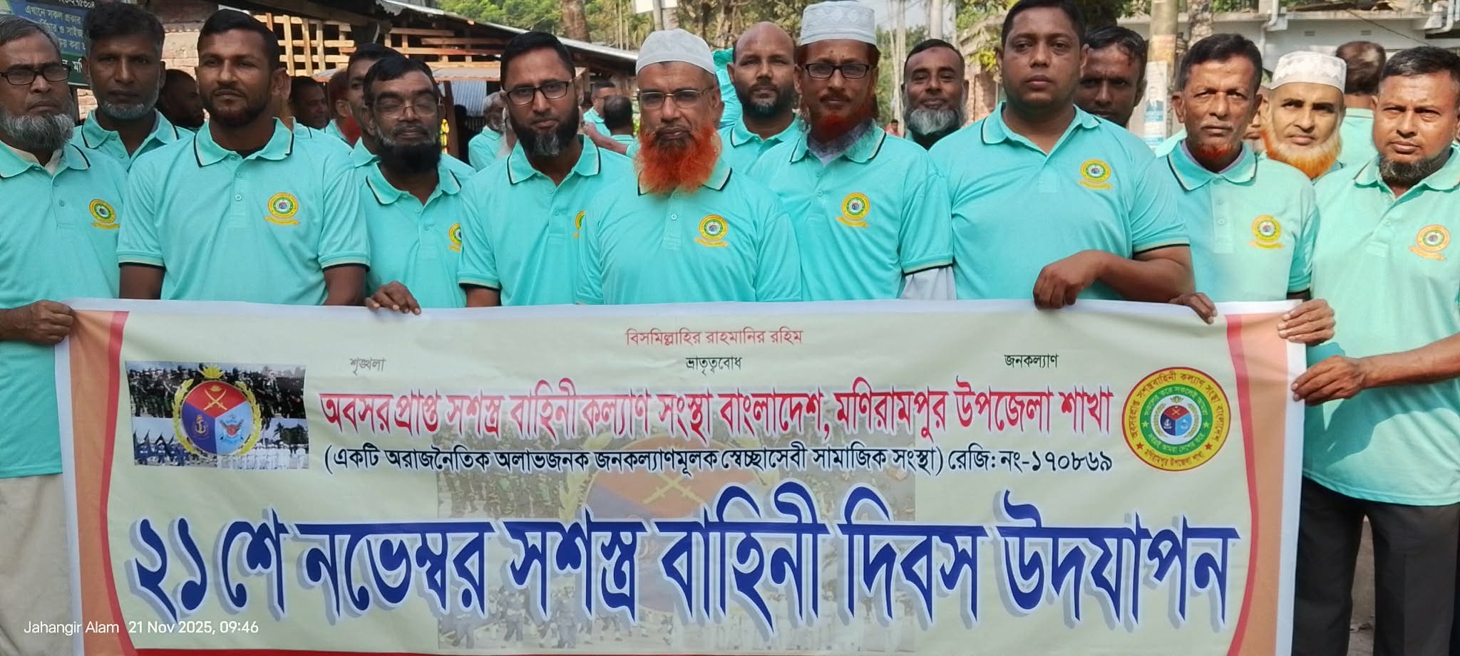 ভ্রাম্যমান প্রতিনিধিঃ- বাংলাদেশ অবসরপ্রাপ্ত সশস্ত্রবাহিনী কল্যাণ সংস্থা মনিরামপুর উপজেলা শাখার উদ্যোগে ২১শে নভেম্বর (শুক্রবার) সশস্ত্রবাহিনী দিবস যথাযথ মর্যাদা ও ব্যাপক উৎসাহ উদ্দীপনার মধ্য দিয়ে পালিত হয়েছে।সশস্ত্রবাহিনী দিবসটি উক্ত উপজেলার সকল অবসরপ্রাপ্ত সশস্ত্র বাহিনীর সদস্যরা একত্রিত হয়ে বিভিন্ন কর্মসূচীর মধ্য দিয়ে উদযাপন করেছেন। কর্মসূচীর মধ্যে ছিল-র্যালী, আলোচনা সভা ও দোয়া,প্রীতিভোজ।দিনের প্রথম কর্মসুচি ছিলো।