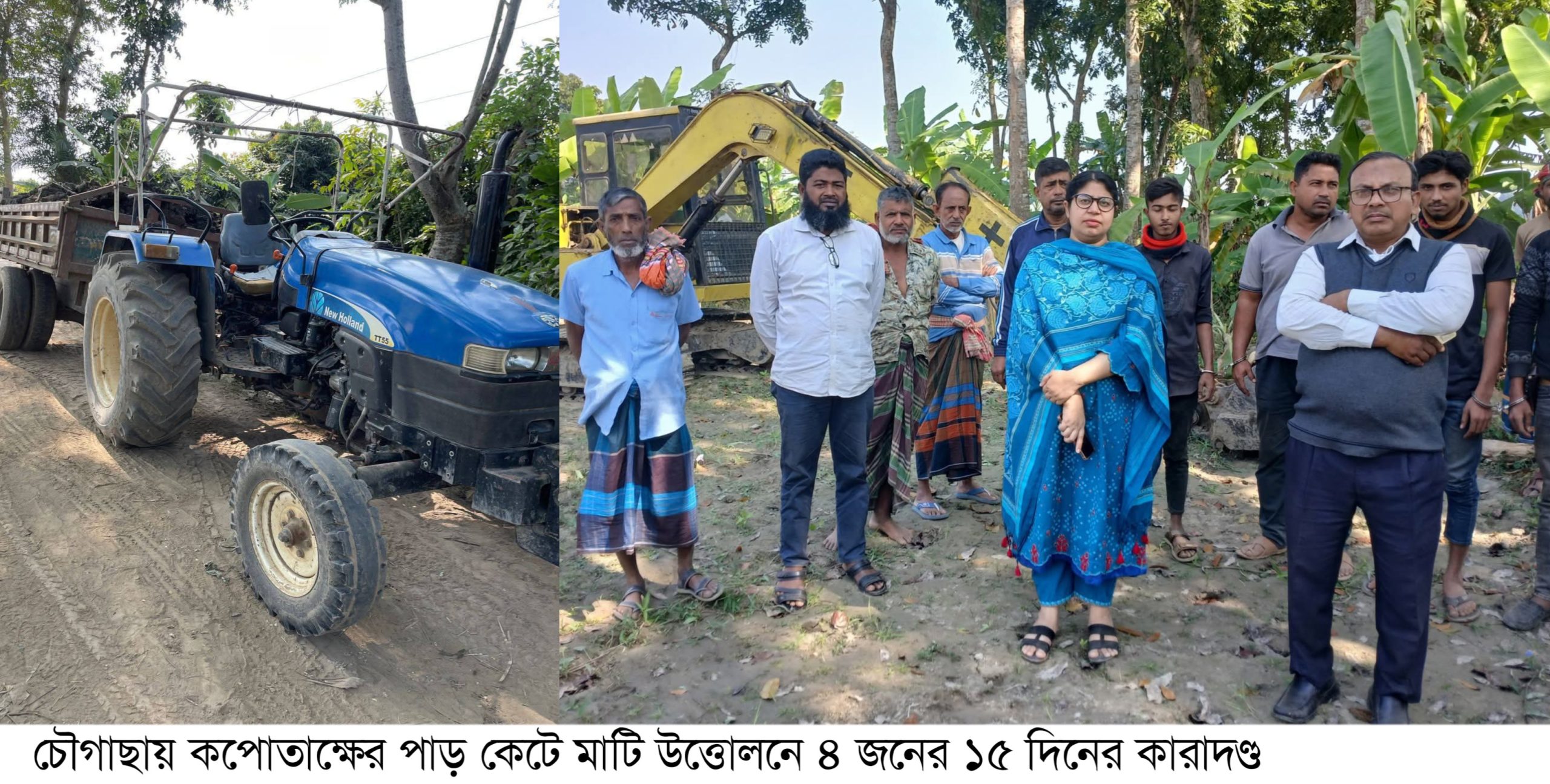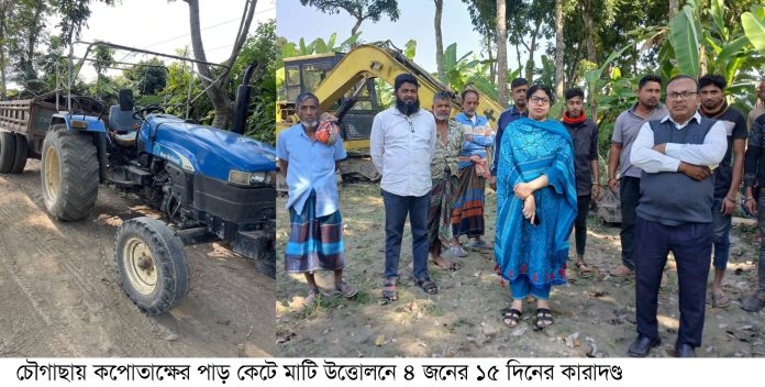রায়হান হোসেন, চৌগাছা পৌর প্রতিনিধি: যশোরের চৌগাছায় কপোতাক্ষ নদের পাড় কেটে অবৈধভাবে মাটি উত্তোলনের অভিযোগে ভ্রাম্যমাণ আদালত ৪ জনকে ১৫ দিনের বিনাশ্রম কারাদণ্ড দিয়েছেন। বৃহস্পতিবার (২৭ নভেম্বর) দুপুরে পাতিবিলা ইউনিয়নের নিয়ামতপুর মৌজায় এই অভিযান পরিচালনা করেন চৌগাছা উপজেলা সহকারী কমিশনার (ভূমি) ও এক্সিকিউটিভ ম্যাজিস্ট্রেট প্রকৌশলী তাসমিন জাহান।