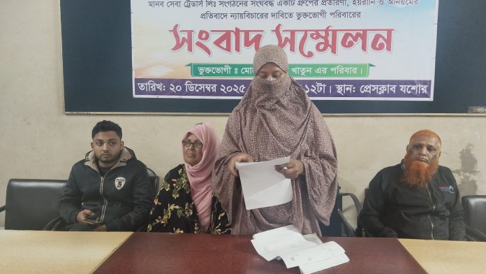 যশোর অফিস : যশোরের মণিরামপুর উপজেলায় স্বাস্থ্য, স্যানিটেশন ও আবাসন প্রকল্পের নামে সংঘবদ্ধ প্রতারণা,অর্থ আত্মসাৎ, হুমকি ও সহিংসতার অভিযোগ এনে ন্যায়বিচারের দাবিতে প্রেসক্লাব যশোরে মিলনায়তনে সংবাদ সম্মেলন করেছে একটি ভুক্তভোগী পরিবার।