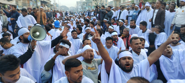 বলেন,কাফনের কাপড়ে মোড়ানো প্রতিবাদ জানিয়ে