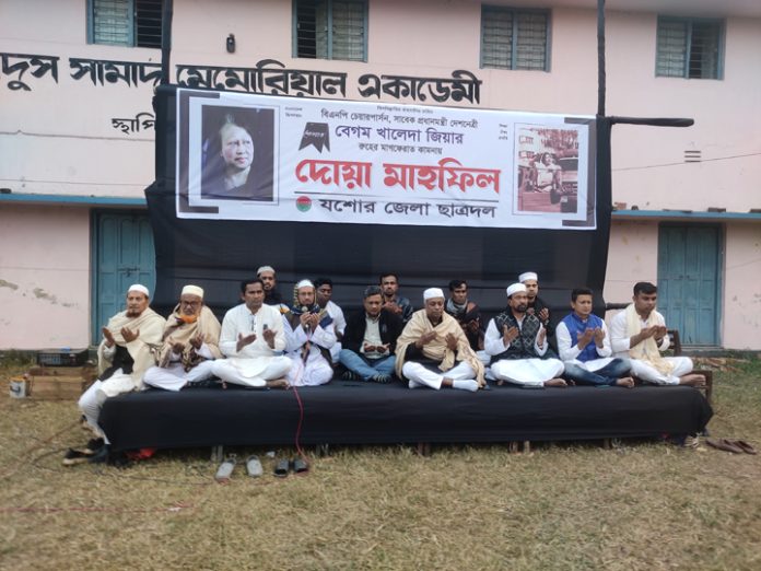 শহরের দড়াটানা জামে মসজিদে অনুষ্ঠিত দোয়া মাহফিলে উপস্থিত ছিলেন যশোর- ৩ ( সদর) আসনে বিএনপি মনোনীত প্রার্থী এবং দলের জাতীয় নির্বাহী কমিটির ভারপ্রাপ্ত সাংগঠনিক সম্পাদক( খুলনা বিভাগ) অনিন্দ্য ইসলাম অমিত, জেলা বিএনপির সাধারণ সম্পাদক দেলোয়ার হোসেন খোকন, সাংগঠনিক সম্পাদক প্রকৌশলী রবিউল ইসলাম, শহিদুল বারী রবু, সাবেক সহসভাপতি গোলাম রেজা দুলু, যশোর চেম্বার অব কমার্স এন্ড ইন্ডাস্ট্রির সভাপতি মিজানুর রহমান খান, সম্পাদক তানভীরুল ইসলাম সোহান, যশোর নগর বিএনপির সভাপতি রফিকুল ইসলাম চৌধুরী মুল্লুক চাঁদ, সদর উপজেলা বিএনপির সাধারণ সম্পাদক আঞ্জুরুল হক খোকন, ডক্টর অ্যাসোসিয়েশন অব বাংলাদেশ ( ড্যাব) যশোর জেলা শাখার নেতা ফারুক এহতেশাম পরাগ প্রমুখ। এছাড়া বিভিন্ন শ্রেণি-পেশার ধর্মপ্রাণ মুসল্লীরা দেশনেত্রীর রুহের মাগফিরাত কামনায় অনুষ্ঠিত দোয়া মাহফিলে অংশ নেন। দোয়া মাহফিল পরিচালনা করেন দড়াটানা জামে মসজিদের ইমাম ও খতিব মুফতি আমানুল্লাহ কাসেমী। জেলা সদর থেকে শুরু করে সকল উপজেলা, পৌর সদর, ইউনিয়ন এবং ওয়ার্ড পর্যায়ে সকল মসজিদে দোয়া মাহফিল অনুষ্ঠিত হয়। দলীয় নেতাকর্মীদের পাশাপাশি এলাকাবাসীর উদ্যোগে দোয়া মাহফিল অনুষ্ঠিত হয়।