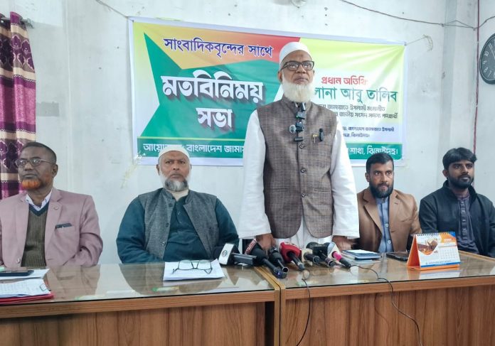 স্টাফ রিপোটার,কালীগঞ্জ (ঝিনাইদহ) : ঝিনাইদহ-৪ আসনের বাংলাদেশ জামায়াতে ইসলামীর মনোনিত প্রার্থী মাওলানা আবু তালিব স্থানীয় সাংবাদিকদের সাথে মতবিনিময় করেছেন। বৃহস্পতিবার দুপুর ১২টায় ঝিনাইদহ সড়কের দলীয় কার্যালয়ে এ মতবিনিময় সভার আয়োজন করা হয়। দলের কালীগঞ্জ উপজেলা শাখা আয়োজিত এ মতবিনিময় সভায় প্রধান অতিথি হিসাবে বক্তব্য রাখেন আসন্ন ত্রয়োদশ জাতীয় সংসদ নির্বাচনে দালিপাল্লার প্রার্থী আবু তালিব।