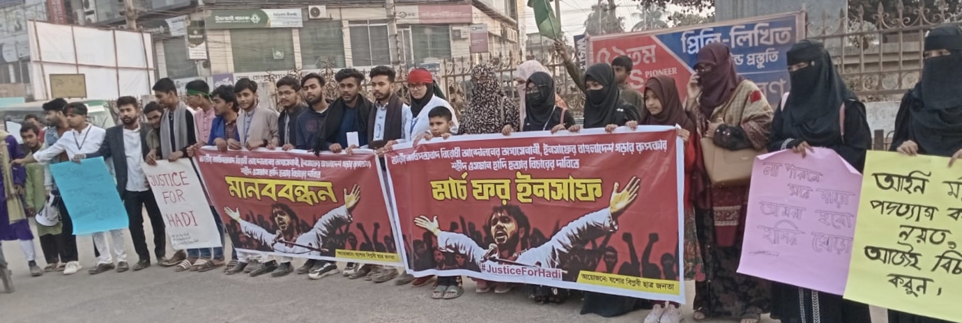 যশোর অফিস : হাদি হত্যার বিচারের দাবিতে যশোর শহরের পালবাড়ি ভাস্কর্য মোড়ে মানববন্ধন ও সড়ক অবরোধ কর্মসূচি পালন করেছে এনসিপি, যশোর জেলা। শুক্রবার বিকেলে এ কর্মসূচি চলে। এনসিপি নেতাকর্মীরা পালবাড়ি ভাস্কর্য মোড়ে মানববন্ধন করে শহীদ হাদি হত্যাকাণ্ডে জড়িতদের দ্রুত গ্রেফতার ও দৃষ্টান্তমূলক শাস্তির দাবি জানান। এ সময় বক্তারা বলেন,যতদিন পর্যন্ত হত্যাকারীদের গ্রেফতার করা না হবে, ততদিন পর্যন্ত তাদের আন্দোলন কর্মসূচি অব্যাহত থাকবে।