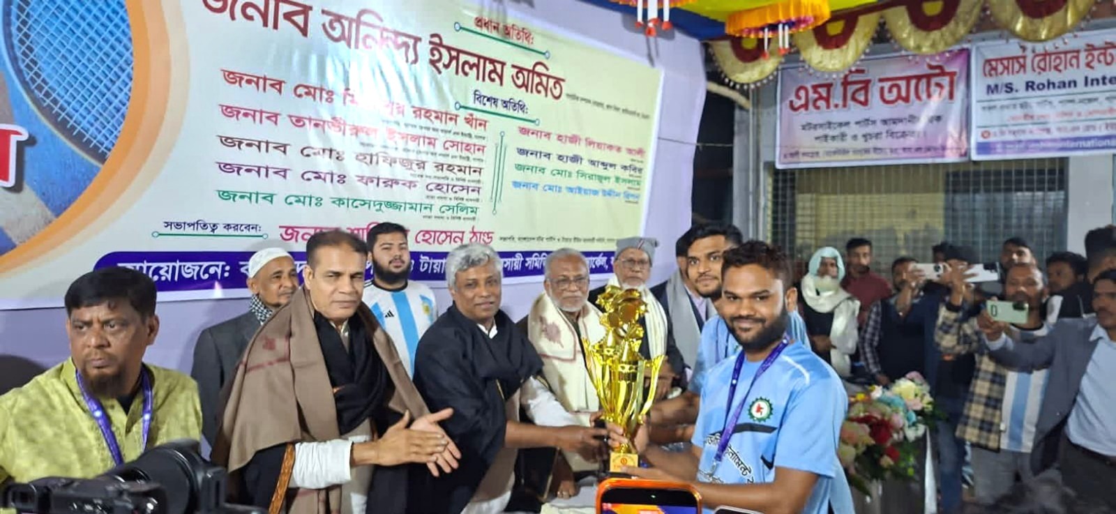 স্পোর্টস রিপোর্টার ॥ বাংলাদেশ মটর পার্টস ও টায়ার টিউব ব্যবসায়ী সমিতি যশোর সার্কেল আয়োজিত বার্ষিক নৈশকালীন ব্যডমিন্টন প্রতিযোগিতা সম্পন্ন হয়েছে। মঙ্গলবার রাতে আর এন রোড সন্দিপন সরকারি প্রাথমিক বিদ্যালয় মাঠে সমাপনী খেলা অনুষ্ঠিত হয়। প্রতিযোগিতায় আরিফ মোর্টস চ্যাম্পিয়ন এবং ব্রাদার্স আটোস রানার আপ হওয়ার গৌরব অর্জন করে। খেলা শেষে এক অনুষ্ঠানের মাধ্যমে প্রধান অতিথি হিসেবে উপস্থিত থেকে চ্যাম্পিয়ন ও রানার আপ দলের হাতে পুরস্কার তুলে দেন বিএনপির জাতীয় নির্বাহী কমিটির ভারপ্রাপ্ত সাংগঠনিক সম্পাদক (খুলনা বিভাগ) অনিন্দ্য ইসলাম অমিত। অনুষ্ঠানে সভাপতিত্ব করেন, বাংলাদেশ মটর পার্টস ও টায়ার টিউব ব্যবসায়ী সমিতির যশোর সার্কেলের সভাপতি শাহিনুর হোসেন ঠান্ডু। অনুষ্ঠানে বিশেষ অতিথি হিসেবে উপস্থিত ছিলেন, যশোর জেলা বিএনপির সাধারণ সম্পাদক দেলোয়ার হোসেন খোকন, যশোর চেম্বার অব কমার্স এন্ড ইন্ডাস্ট্রি’র সভাপতি মিজানুর রহমান খান, বাংলাদেশ মটর পার্টস ও টায়ার টিউব ব্যবসায়ী সমিতির যশোর সার্কেল সাবে সভাপতি হাফিজুর রহমান ও দাতা সদস্য কাসেদুজ্জামান সেলিম। অনুষ্ঠানে অন্যান্য অতিথিদের মধ্যে উপস্থিত ছিলেন, নগর বিএনপির সাংগঠনিক সম্পাদক মনিরুজ্জামান মাসুম, বিশিষ্ট ব্যবসায়ী হাজী লিয়াকত আলী, হাজী আব্দুল করিম, সিরাজুল ইসলাম, আয়াজ উদ্দিন রিপন, বাংলাদেশ মটর পার্টস ও টায়ার টিউব ব্যবসায়ী সমিতির যশোর সার্কেলের সাধারণ সম্পাদক সেলিম রেজা বাপ্পি, সহ-সভাপতি শেখ আলাউদ্দিন, কোষাধ্যক্ষ মনিরুজ্জামান দিলু, দপ্তর সম্পাদক শাকিল আহমেদ প্রমুখ। উল্লেখ্য মোট ৩২ টি দল নিয়ে গেল ২৯ ডিসেম্বর প্রতিযোগিতা শুরু হয়।