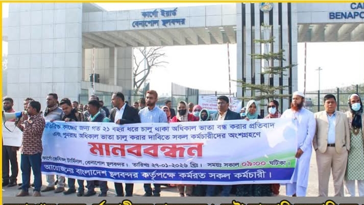 বেনাপোল থেকে এনামুলহকঃ অধিকাল ভাতা বন্ধের প্রতিবাদে বেনাপোলে বন্দর কর্মচারীদের মানব বন্ধনে আজ একঘন্টা বন্ধ ছিল আমদানি,রফতানি ও বন্দর থেকে পণ্য খালাস কার্যক্রম। মঙ্গলবার সকাল সকাল সাড়ে ৯ টায় থেকে সকাল সাড়ে ১০ টা পর্যন্ত স্থলবন্দর দাবি আদায় পরিষদের আয়োজনে বেনাপোল বন্দরের কার্গোভেহিকেল টার্মিনালের সামনে এ মানবন্ধন অনুষ্ঠিত হয়। মানবন্ধনে বন্দরের দেড় শতাধিক কর্মচারী অংশ নেয়।