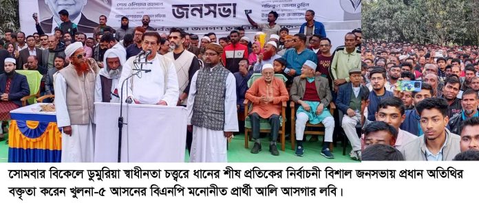 সোমবার বিকেলে ডুমুরিয়া স্বাধীনতা চত্ত্বরে ধানের শীষ প্রতিকের নির্বাচনী বিশাল জনসভায় প্রধান অতিথির বক্তৃতায় খুলনা-৫ এর বিএনপি মনোনীত ধানের শীষ প্রতীকের সংসদ সদস্য প্রার্থী আলি আসগার লবি একথা বলেন।