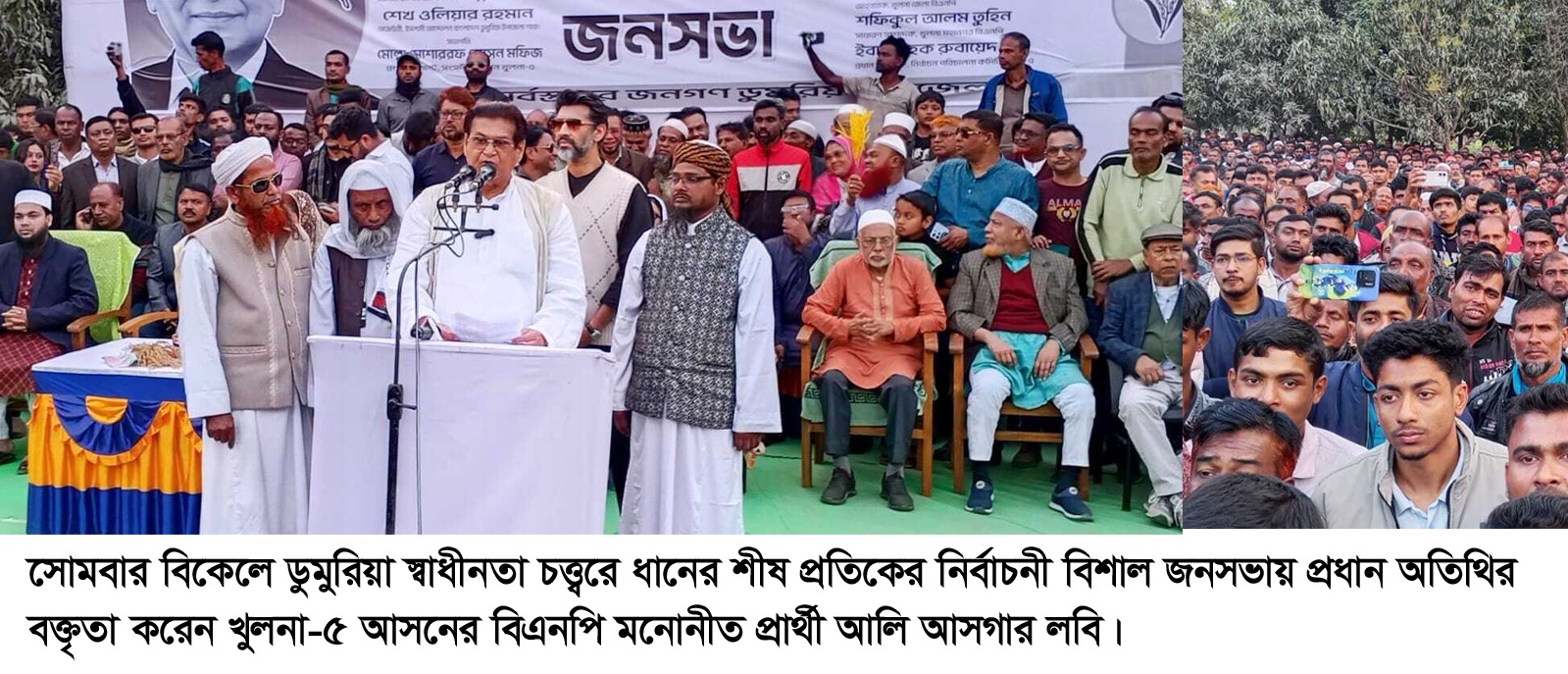 ভ্রাম্যমান প্রতিনিধি,ডুমুরিয়া। খুলনা-৫ এর বিএনপি মনোনীত ধানের শীষ প্রতীকের সংসদ সদস্য প্রার্থী আলি আসগার লবি বলেন, আগামী ১২ ফেব্রুয়ারি সংসদ নির্বাচনে, আপনারা ধানের শীষে ভোট দিয়ে, আমাকে আপনাদের সেবক হিসেবে নিযুক্ত করুন। আমি এই মাটিতে দাঁড়িয়ে কথা দিচ্ছি আমি আপনাদের দলমত নির্বিশেষে, সকল সাধারণ শান্তি প্রিয় মানুষের জিম্মাদার হয়ে থাকলাম। আমার জীবন থাকতে এই এলাকার কোন মানুষকে আমি হয়রানি হতে দেবো না। আমি কথা দিচ্ছি, কোন দুর্বৃত্ত, সন্ত্রাসী, চাঁদাবাজদের ঠাঁই হবে না আমার কাছে। খারাপ মানুষ সে যে দলেরই হোক ডুমুরিয়ার মাটিতে তাকে ভালো হয়েই চলতে হবে। কোন ধরনের জন হয়রানি সহ্য করা হবে না। আপনারা আমাকে বিশ্বাস করতে পারেন। আপনারা ঠকবেন না। আপনাদের স্বাক্ষী রেখে বলছি, বিএনপির সুযোগ্য চেয়ারম্যান ইতোমধ্যে ঘোষণা দিয়েছেন, বিএনপি করতে হলে ভালো হয়ে চলতে হবে। বিএনপি পরিচয় দিয়ে, কোন সাধারণ মানুষের শান্তি বিনষ্ট করলে বিএনপিতে তার ঠাঁই হবে না।